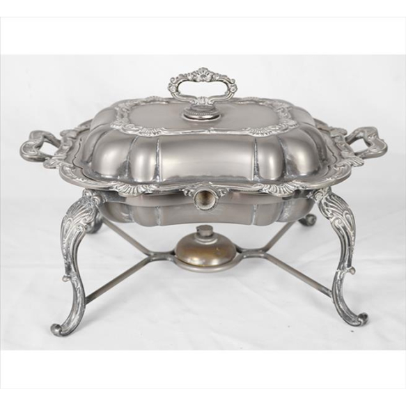 Rechaud completo de metal espessurado à prata, contendo duas travessas, tampa e base, com resquício de marca sob a base. Alt. 26 x 43 x 30cm. Inglaterra, meados séc. XX (pega da tampa precisa refixar)