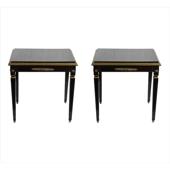 Par de mesas lateral estilo Luís XVI/Império, estrutura de madeira com filetes dourados, pernas retas e caneladas, ornamentada com guarnições de metal representando guirlandas. Alt. 55 x 55 x 55cm cada. Séc. XX