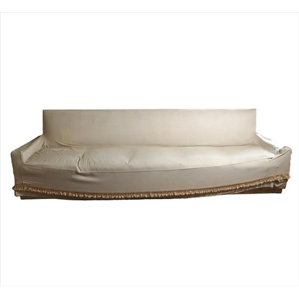 Sofá 05 lugares com estrutura de madeira, forração de tecido fino com cetin, base revestida de folha cromada, acompanha capa de tecido com franjas. Alt. 88 x 295 x 78cm. Brasil, década 60/70 (capa com rasgos)