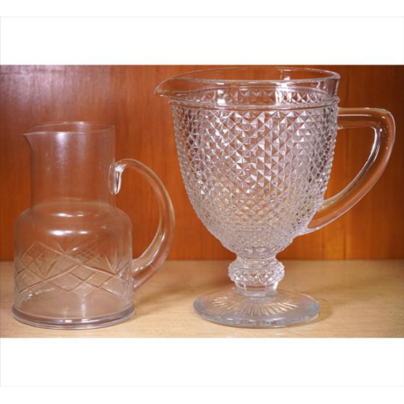 Lote contendo duas jarras de vidro, sendo uma com lapidação bico-de-jaca. Alt. 20 x 20 x 13cm e 16 x 15 x 10cm. (com pequenos bicados)