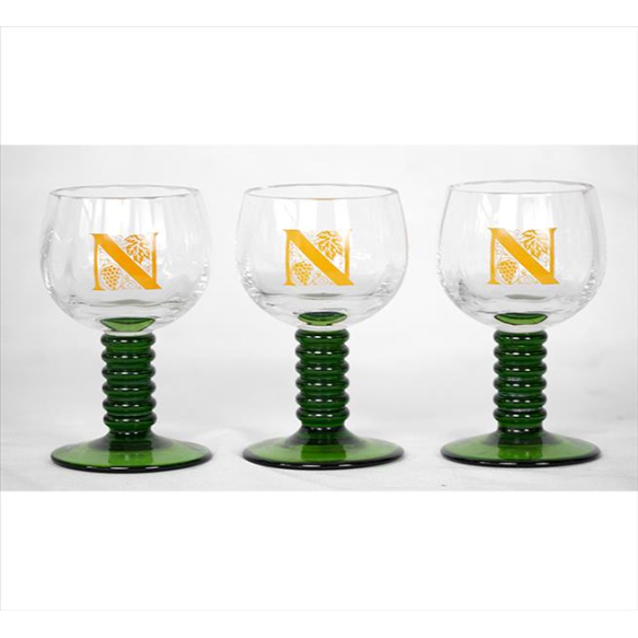 CRISTAIS HERING, Jogo de 03 taças de cristal, hastes retorcidas na tonalidade verde, parte superior decorada com letra N dourada. Alt. 10 x 06cm cada. Brasil, séc. XX (uma com pequeno bicado)