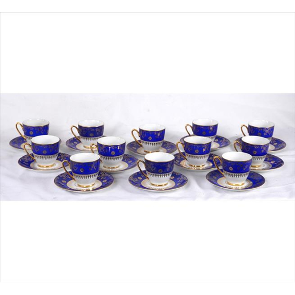 FINE BOHEMIAN CHINA, Jogo de 12 xícaras de café de porcelana com respectivos pires, decoradas com motivos florais e guirlandas douradas, sobre fundo na tonalidade azul, marca sob a base. Tchecoslováquia, início séc. XX