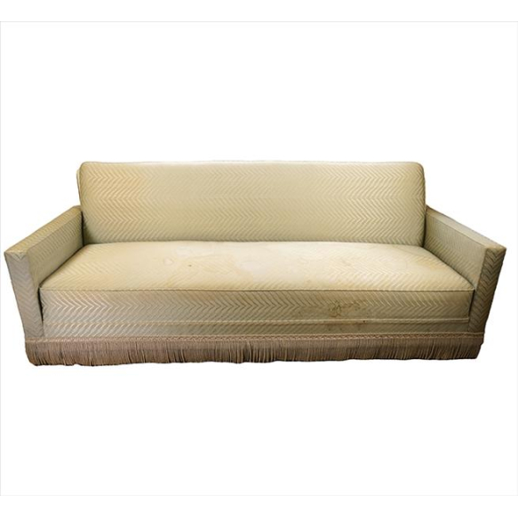 Sofá com estilo Maison Jansen, estrutura de madeira, fina forração de tecido com padrão espinha-de-peixe na tonalidade verde, terminando em franjas, forma reta. Alt. 77 x 207 x 87cm. Brasil, meados séc. XX
