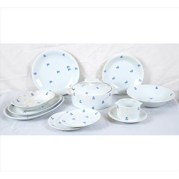 Jogo de jantar de porcelana com detalhes florais azuis, completo para 12 pessoas, contendo 12 pratos rasos, 12 fundos, 12 sobremesa, 03 travessas, 01 sopeira, 01 molheira, 01 saladeira. Total 42 peças