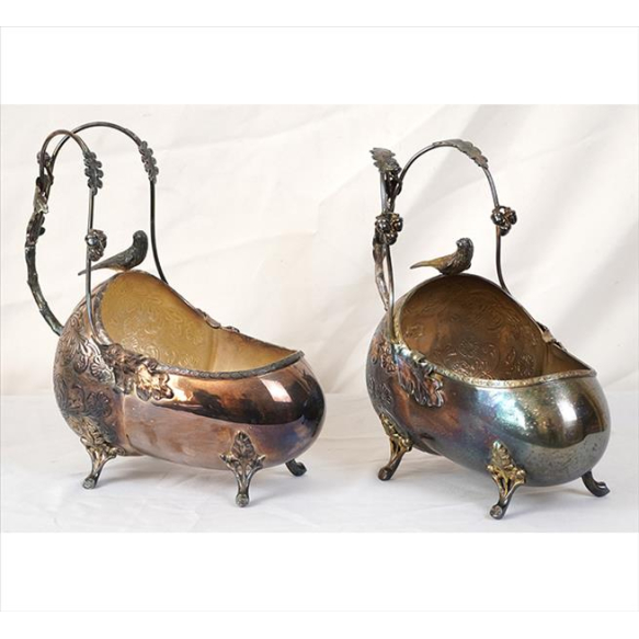 Par de porta-garrafas de metal espessurado à prata, ornamentados com motivos florais e figura de pássaro. Alt. 29 x 30 x 16cm cada. Séc. XX