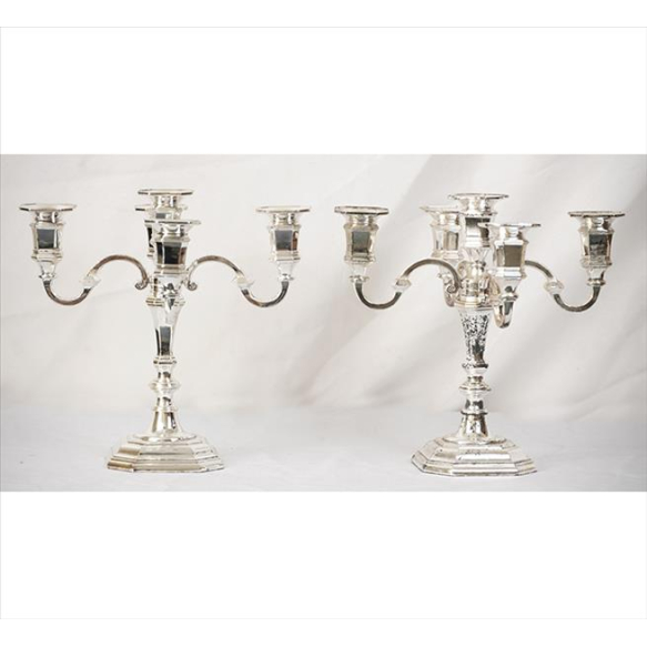 Par de candelabros de metal espessurado à prata, suporte para 05 velas, formas facetadas. Alt. 26 x 28 x 28cm (banho desgastado)
