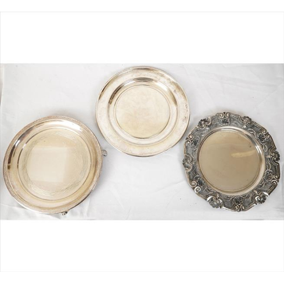 Lote contendo 03 salvas de metal espessurado à prata, sendo uma ricamente decorada com rocalhas, outra com guilhoche e a última lisa. Diam. 30cm cada (aproximada)