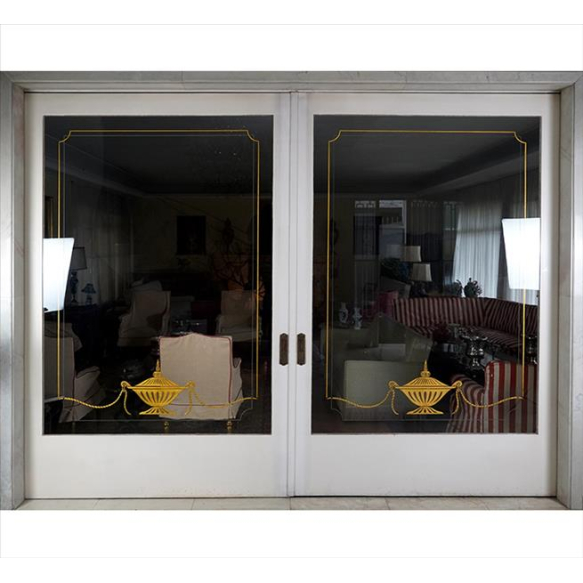 Portas de correr com estrutura de ferro patinado, decoradas com placas de vidro acidadas e detalhes dourados. Alt. 268 x 178cm (cada folha). Meados séc. XX (será necessário contratar serviço especializado para remoção das mesmas, por responsabilidade do arrematante)