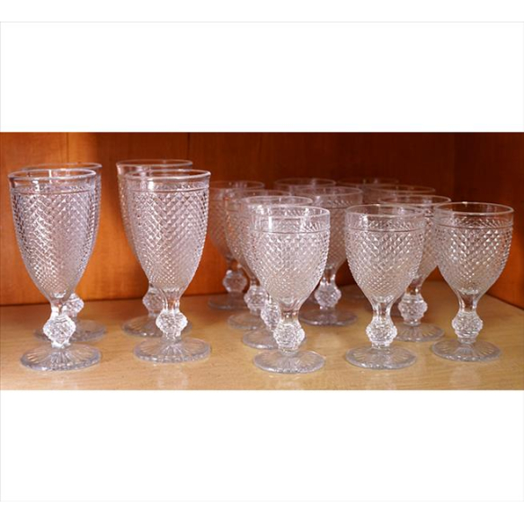 Jogo remanescente de taças de vidro com lapidação bico-de-jaca, contendo 04 para água e 11 para vinho tinto. Portugal séc. XX.