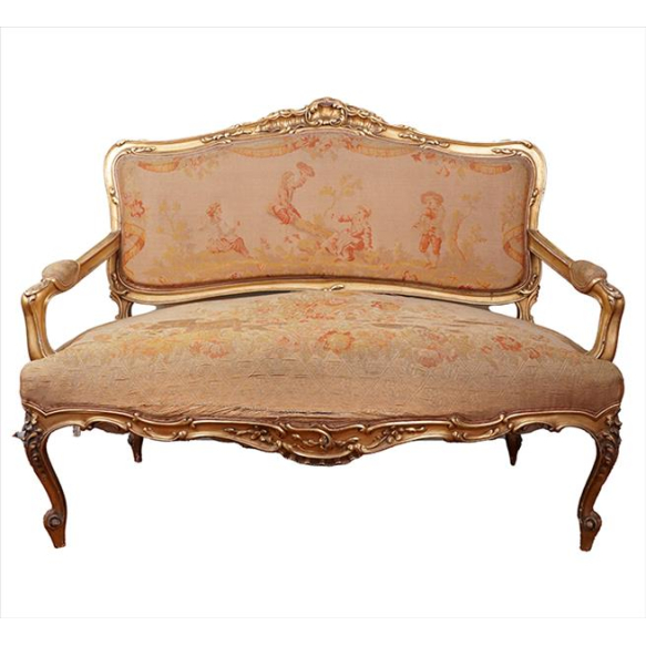Sofá de madeira entalhada e dourada, estilo Luís XV, ornamentado com ramagens e volutas, forração de tecido, acompanha capa de tecido na tonalidade salmão com franjas brancas. Alt. 103 x 133 x 70cm. Europa início séc. XX