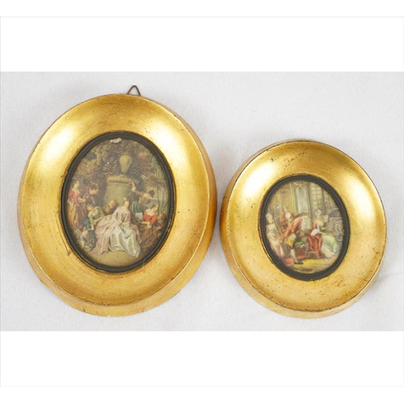 Lote contendo duas miniaturas com reproduções offset de obras europeias, molduras de madeira dourada. 14 x 12cm e 11 x 10cm.