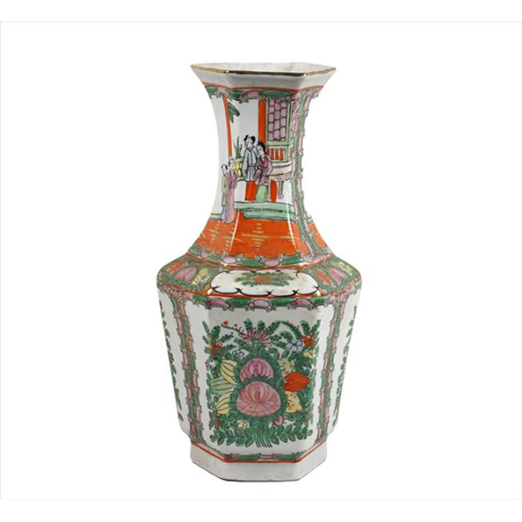 Vaso de porcelana oriental com esmalte dito Mandarim, decorado com motivos florais e figuras, marca da manufatura sob a base. Alt. 38 x 18cm. China, séc. XX