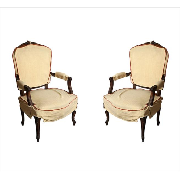 Par de cadeiras de braços com estrutura de madeira, estilo Luís XV, forração de tecido, acompanham capas de fino tecido com detalhes salmão. Alt. 104 x 68 x 58cm cada. Séc. XX