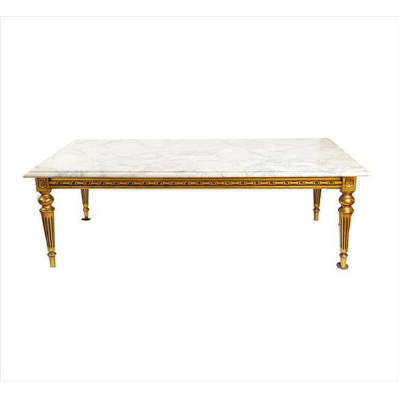 Mesa de centro de madeira entalhada e dourada, estilo Luis XVI, pernas caneladas, detalhes de rosáceas, acompanha tampo retangular de mármore. Alt. 40 x 122 x 61cm.Meados séc. XX