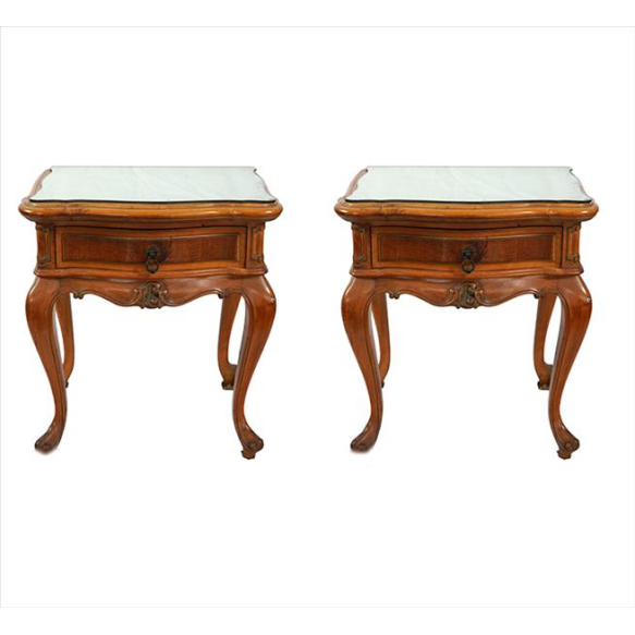FÁBRICA DE MÓVEIS ARTÍSTICOS APER, Par de mesas de cabeceira com estrutura de madeira nobre, estilo Luís XV, pernas recurvas com saia recortada, contém uma gaveta frontal com puxador de metal, conservam selo da manufatura no verso. Alt. 59 x 52 x 42cm cada. Brasil, meados séc. XX
