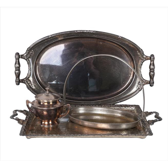 Lote contendo 04 peças de metal, sendo estas duas bandejas, uma cesta e um açucareiro. 12x16x11cm (menor) e 52x30cm (maior) (cesta com restauro)