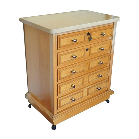 Cômoda de madeira clara, contendo 05 gavetas frontais, sendo a superior com chave, estrutura terminando em rodízios. Alt. 94 x 80 x 50cm.