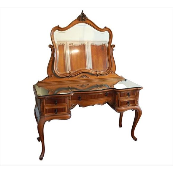 Móvel penteadeira de madeira nobre, estilo Luís XV, Pernas recurvas, detalhes representando ramagens, contém 05 gavetas frontais com puxadores de metal, espelho superior bisotado e articulado. Alt. 170 x 132 x 46cm. Brasil Meados séc. XX