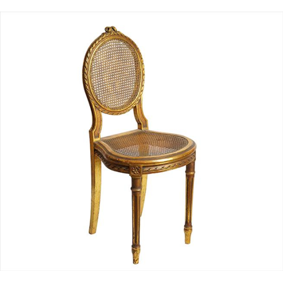 Cadeira de madeira entalhada e dourada, estilo Luís XVI, pernas caneladas, assento e espaldar de palhinha natural. Alt. 90 x 40 x 38cm. Início séc. XX