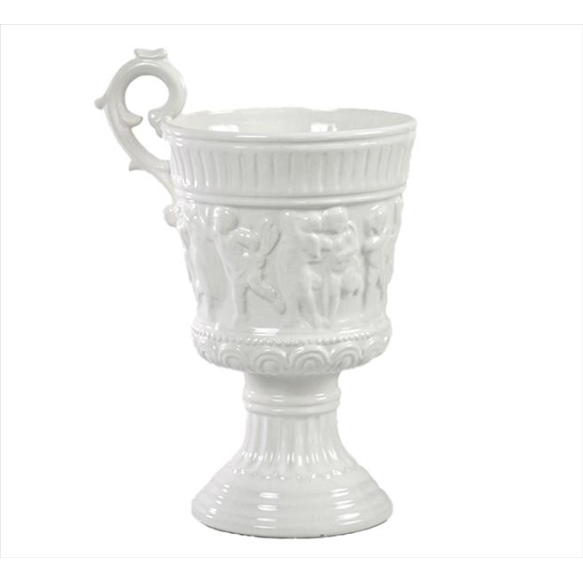 Ânfora de faiança esmaltada na tonalidade branca, ornamentada com figuras de querubins. Alt. 29 x 20 x 16cm. Europa, séc. XX (com pequeno bicado sob a base)
