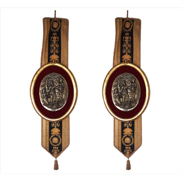 Par de placas de bronze intituladas Cerere, montadas sobre faixa de fino tecido com características da grife Versace. Alt. 117 x 40cm cada.
