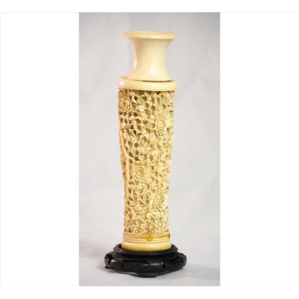 Vaso solitário dito solifleur de osso natural ricamente esculpido, representando guirlandas e ramagens. Alt. 24 x 08cm (total c/ base). China, séc. XIX (no estado / com lascado e restauros)