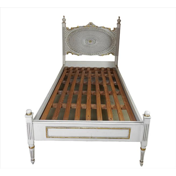 Cama de solteiro com estrutura de madeira patinada e dourada, estilo Luís XVI, cabeceira com palhinha sintética também patinada. Alt. 120 x 98 x 220cm. (total c/ cabeceira) (algumas ripas do estrado rompidas)