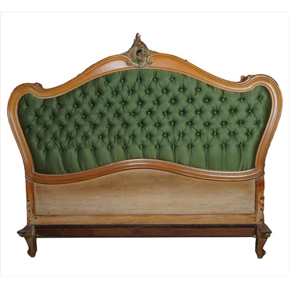 FÁBRICA DE MÓVEIS ARTÍSTICOS APER, Cabeceira de cama de casal, estritira de madeira nobre, estilo Luís XV, ornamentada com ramagens e volutas, apoio com forração de tecido na tonalidade verde, detalhe captonne, selo da manufatura no verso. 137 x 167 x 16cm. Meados séc. XX