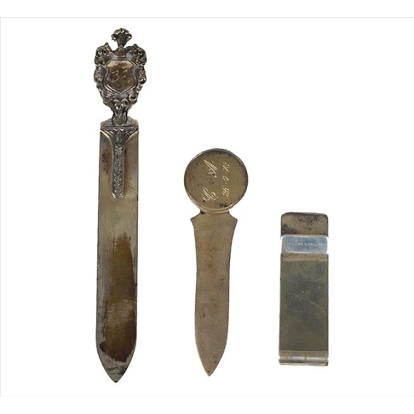 Lote contendo 03 peças de prata-de-lei, sendo dois abridores de cartas e um prendedor de gravatas da Tiffany Co. 06 x 02cm (menor) e 14 x 02cm (maior).
