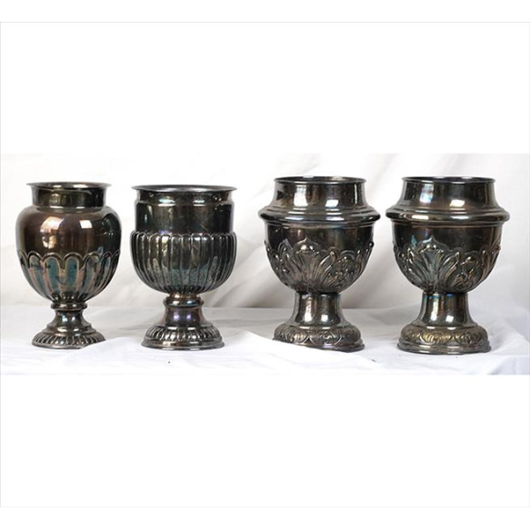 Lote contendo 04 vasos de metal espessurado à prata, ornamentados com motivos florais e guirlandas em relevo. Alt. 24 x 13cm cada. (média aproximada)