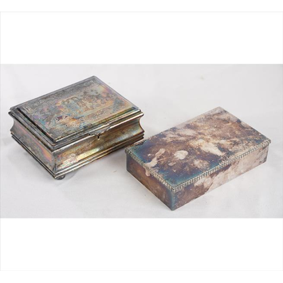 MERIDIONAL, Lote contendo duas caixas de metal espessurado à prata, sendo elas uma porta jóias com interior de veludo azul (com chave), e outra com interior de madeira. Alt. 07 x 14 x 11cm e 04 x 16 x 10cm. , respectivamente