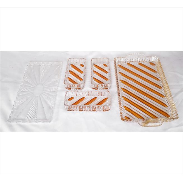 Jogo de 05 travessas de vidro, sendo 04 com detalhes na tonalidade âmbar. 04x37x18cm (maior) e 03x16x07cm (menor). Séc. XX(a travessa âmbar no estado , com restauro)