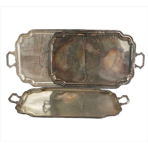 Lote contendo 04 bandejas de metal espessurado à prata, sendo 03 WOLFF, ornamentadas com gregas nas bordas, e uma ratengular precisando restauro.