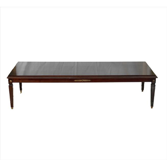 Mesa de centro de madeira, estilo Luís XVI,pernas caneladas, ornamentada com inclusão de rosáceas e guirlandas de metal. Alt. 39 x 160 x 66cm. Séc. XX