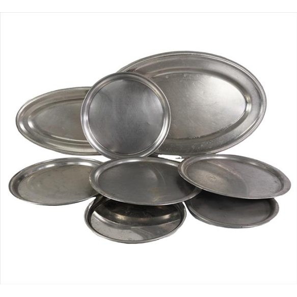 Grande lote contendo 102 bandejas de inox, formatos e tamanhos diversos. 66 x 43cm (maior) e diam. 29cm (menor)