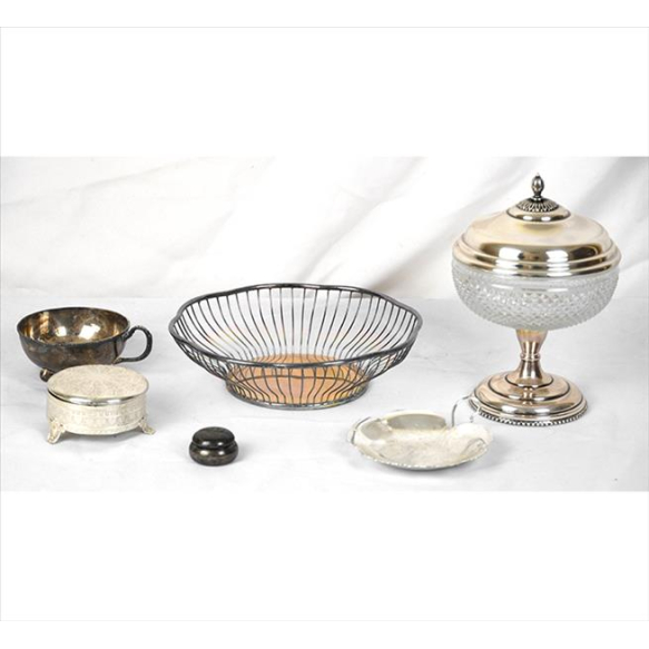Lote contendo 06 peças de metal, sendo estas 01 caixa porta-pílulas, 01 compoteira, 01 caixa circular, 01 centro de mesa e 01 lavanda. Diam 15cm (maior) e 02 x 04cm (menor)