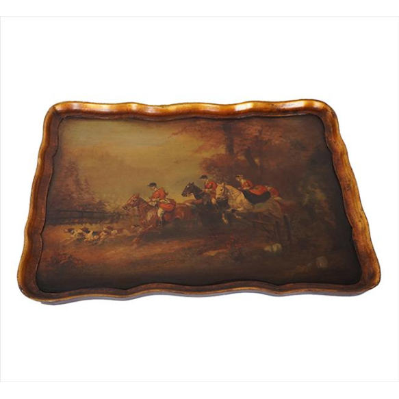Bandeja de madeira com reprodução de cena de caça. 35 x 47cm. Europa, séc. XX