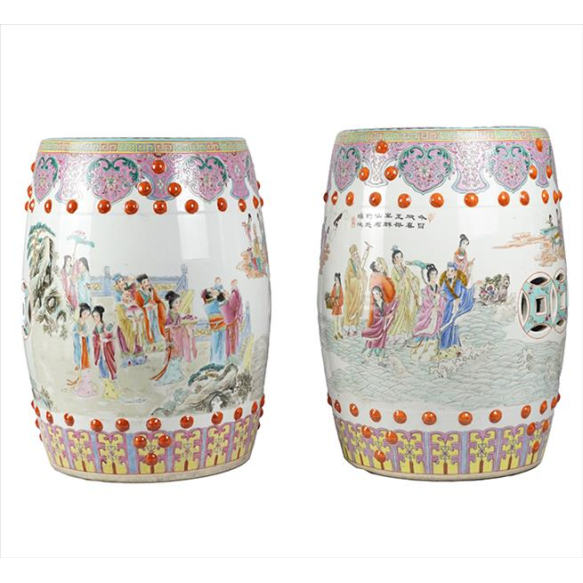 Par de garden-seats de porcelana oriental esmaltada, decorados com figuras orientais. Alt. 48 x 30cm cada. China, séc. XX