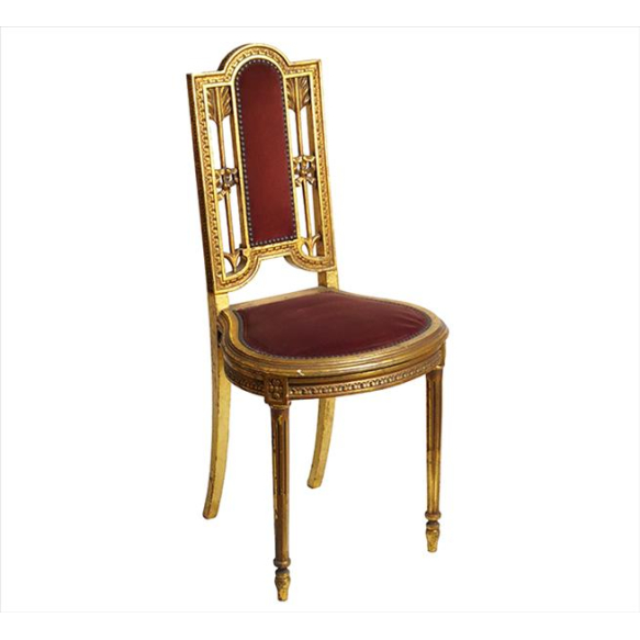 Cadeira de madeira entalhada e dourada, estilo Luis XVI, assento e espaldar com forração de veludo na tonalidade vinho, terminando em tarraxas. Alt. 90 x 42 x 38cm. Início séc. XX