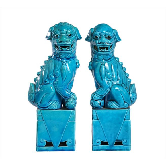Par de esculturas orientais de porcelana esmaltada na tonalidade azul turquesa, representando cães de fó. Alt. 30 x 09 x 07cm. China, séc. XX