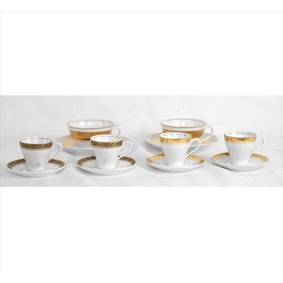PORCELANA REAL, Conjunto de xícaras de chá e café de porcelana, ornamentados com frisos dourados, contendo 12 chá com pires e 14 café com pires.