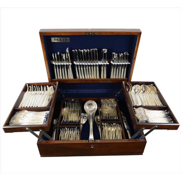 WOLFF, Faqueiro de metal espessurado à prata na caixa original, decorado com gregas, completo para 12 pessoas, contendo serviço de peixe, sendo 12 facas jantar, 12 garfos, 12 colheres, 12 f. sobremesa, 12g. bs., 12c. sb., 12 g. peixe, 12 g/ peixe e 10 peças de servir, total 106 peças. 14 x 54 x 40cm (caixa)