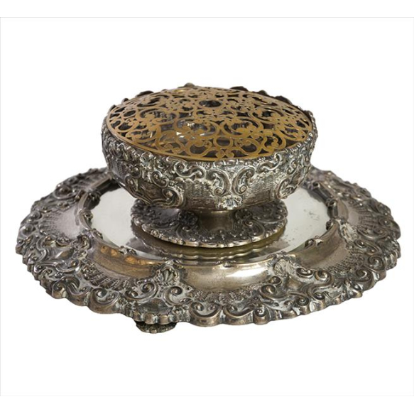 Floreira com presentoir espelhado, estrutura de prata-de-lei, contraste Casa das Pratas, marca do prateiro A. Costa, teor 833, ricamente adornada com rocalhas estilizadas e guirlandas, parte superior com vermeil. Alt. 15 x 35cm. (total). Brasil, séc. XX