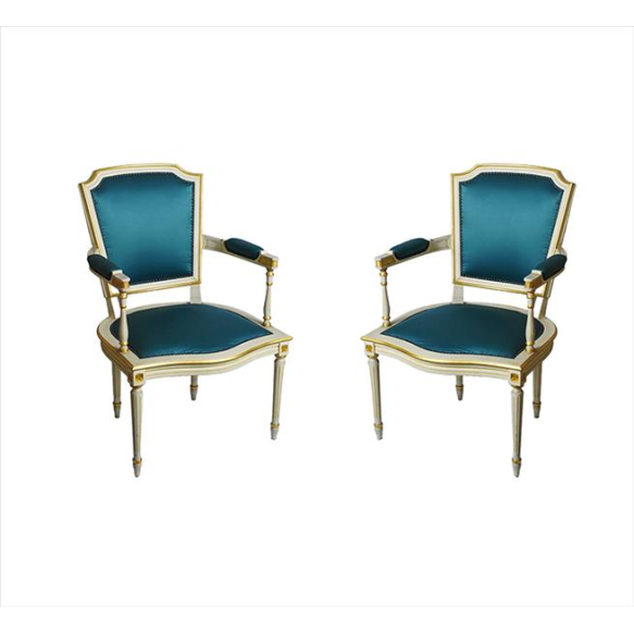 Par de poltronas de madeira patinada e dourada, estilo Luís XVI, assentos com estrutura de molas e tecido na tonalidade verde, terminando em tarraxas. Alt. 87 x 57 x 68cm cada. Séc. XX (uma delas com restauro no braço)