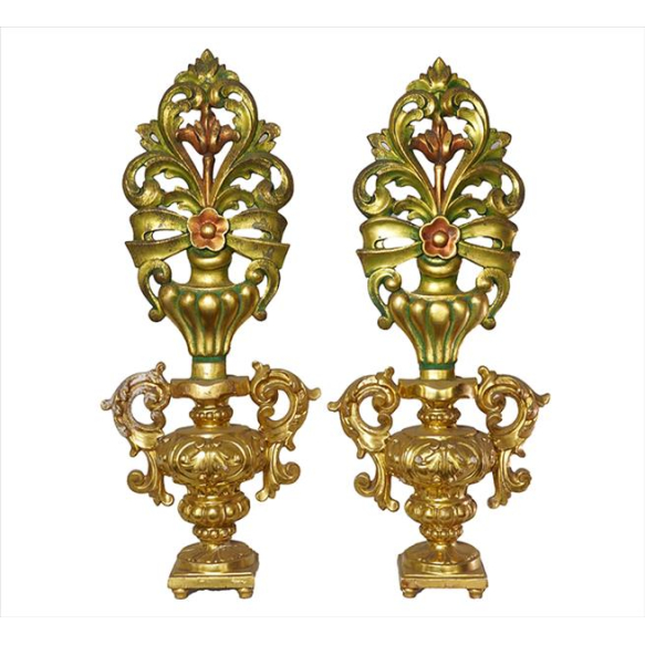 Par de palmas de madeira entalhada e dourada, parte superior representando arranjo floral e inferior ânforas. Alt. 74 x 30 x 14cm. Brasil, início séc. XX (um deles com restauro na base / douração / patina tardia)