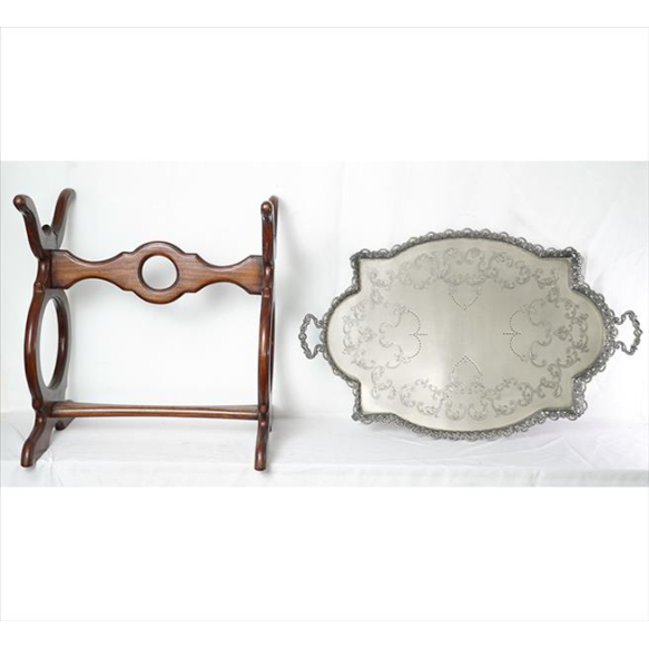 Travessa de metal espessurado à prata, ornametanda com guirlandas cinzeladas, acompanha base adaptada de madeira nobre. Alt. 12 x 71 x 45cm e 50 x 45 x 33cm, respectivamente