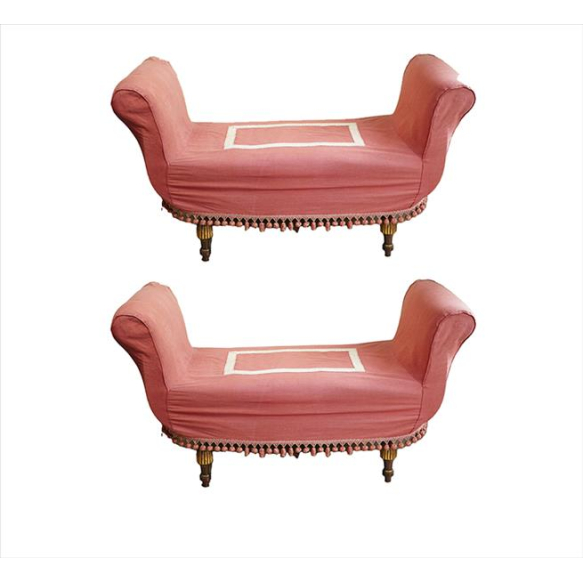 Par de recamiers de madeira entalhada e dourada, forração de tecido terminando em tarraxas, acompanha capa de fino tecido na tonalidade rosa, terminando em franjas. Alt. 70 x 130 x 50cm cada. Meados séc. XX