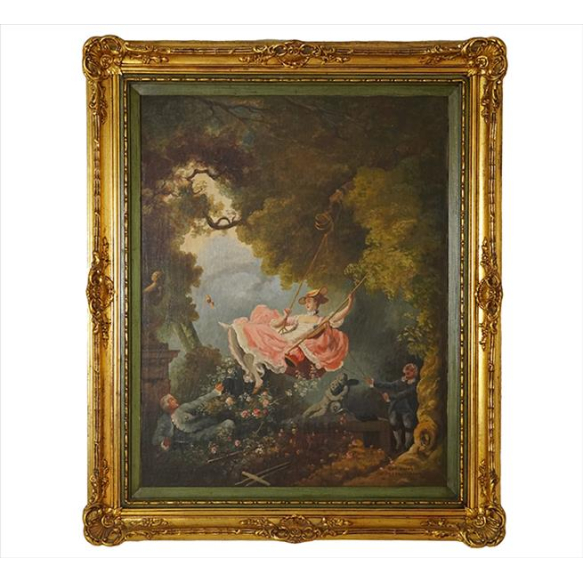 D'ÁPRÉS JEAN-HONORE FRAGONARD, Reprodução pintada à mão da obra de Fragonard - O Balanço, com fina moldura de madeira entalhada e dourada. 112 x 92cm. (total c/ moldura)