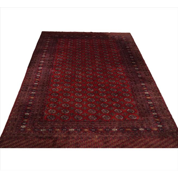 Tapete Tekke, decoração com diversos guls sobre campo central, campo com tonalidade predominante vermelha, borda tripla repletas de rosáceas. 331 x 254cm = 8,4m2