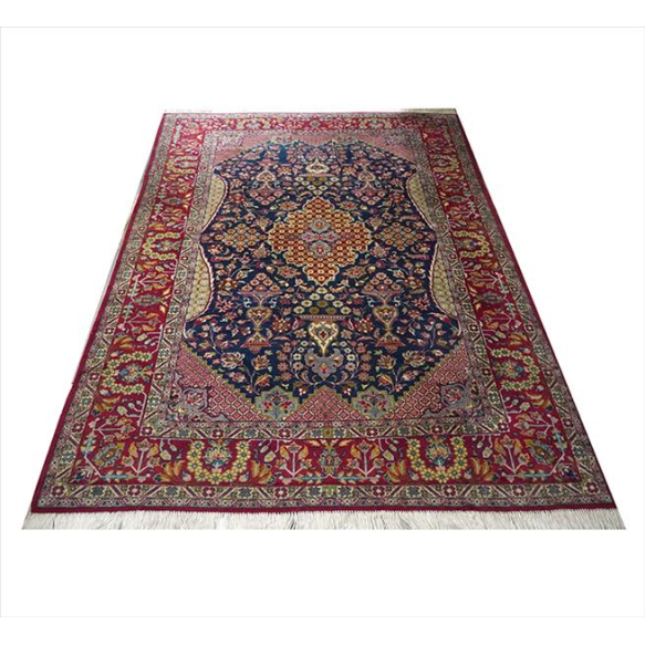 Tapete Kashan, decoração floral com medalhão central, campo com tonalidade predominante azul-marinho, bordas na tonalidade vermelha. 302 x 221cm = 6,67m2